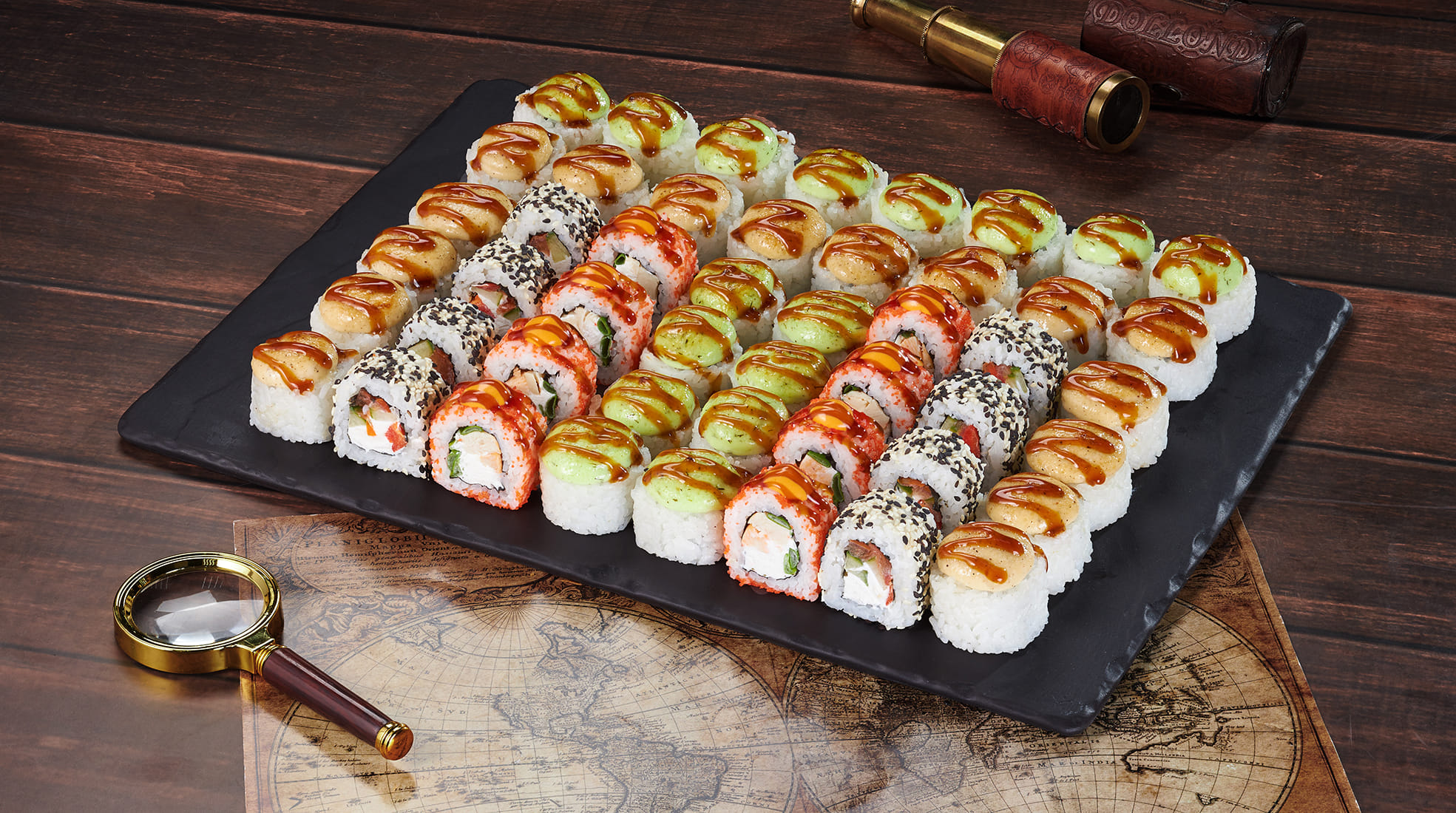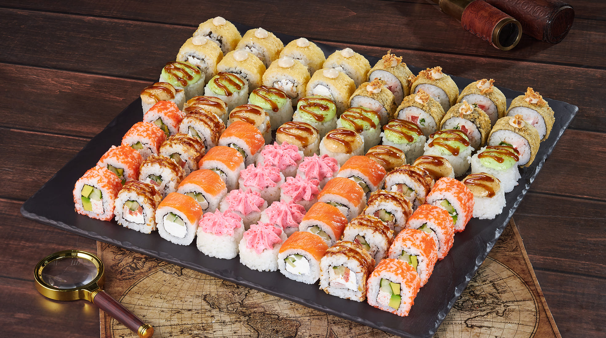 Ролл Филадельфия Лайт (8 шт.), Ролл Кракатау фреш (8 шт.), Ролл Кентукки (8 шт.), Ролл Египетская курица (8 шт.), Ролл Кентукки хот (8 шт.), Ролл Эль Пасо (8 шт.), Ролл Карибы (8 шт.), Ролл Мальта с сыром (8 шт.) *Не забудьте заказать имбирь, васаби и соевый соус. Они не входят в стоимость заказа. *Внешний вид блюда может отличаться от фото на сайте.